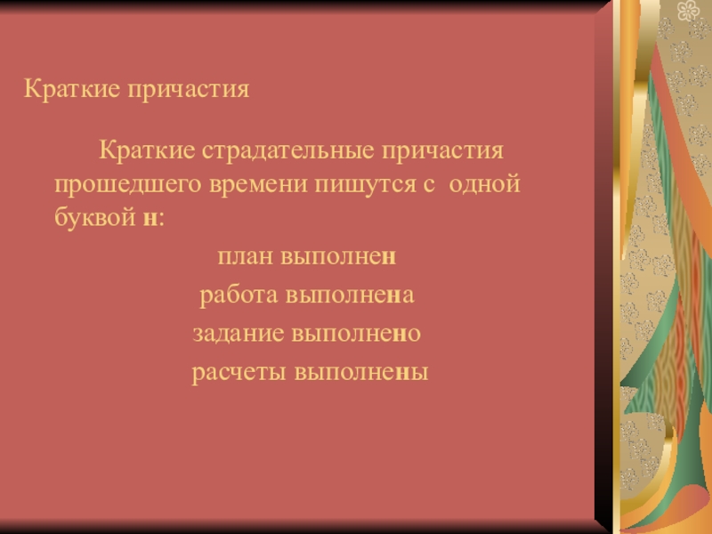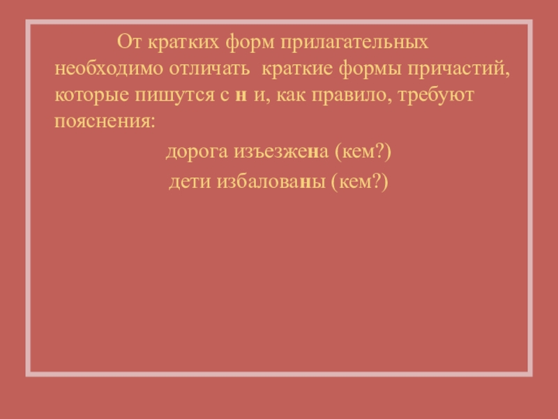 Слайд 20 От кратких форм прилагательных необходимо отличать краткие формы причастий, которые пишутся