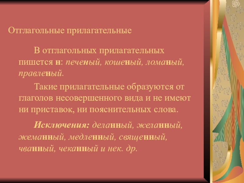 В отглагольных прилагательных пишется н: печеный, кошеный, ломаный, правленый.