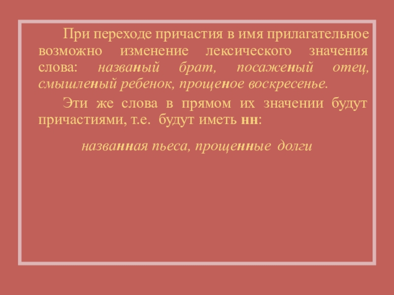 Слайд 14 При переходе причастия в имя прилагательное возможно изменение лексического значения слова: