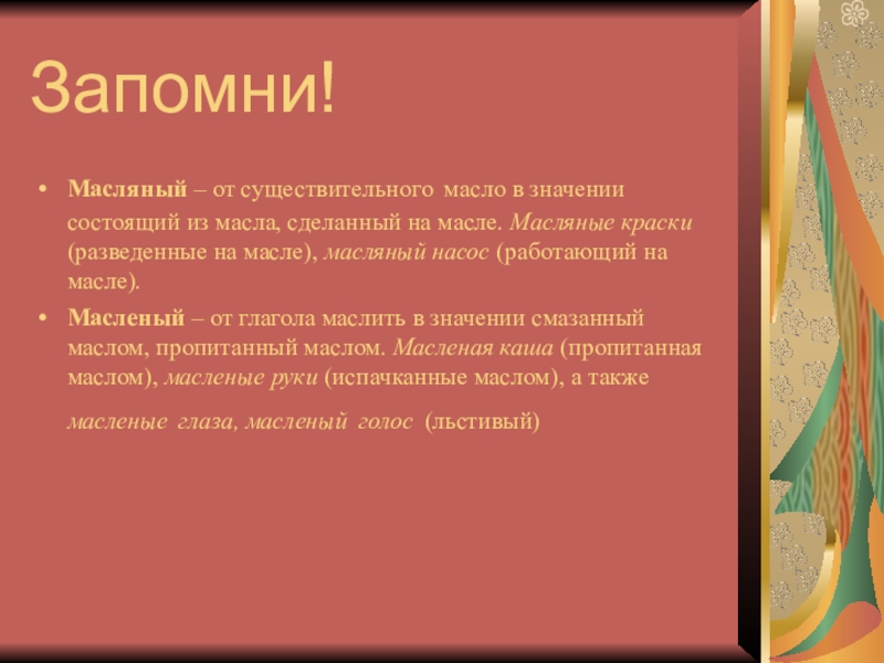 Масленый – от глагола маслить в значении смазанный маслом, пропитанный маслом. Масленая каша (пропитанная маслом), масленые руки (испачканные маслом), а также масленые глаза, масленый голос (льстивый)