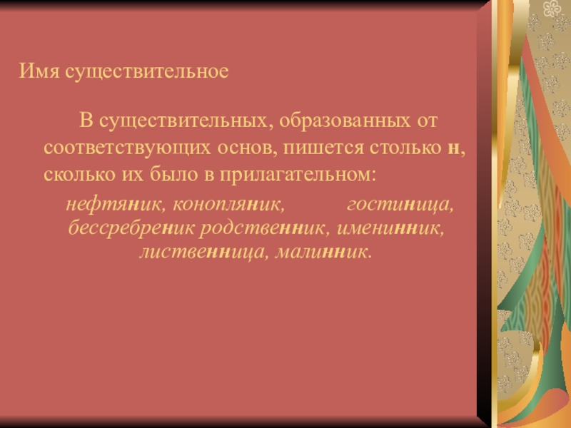 нефтяник, конопляник, гостиница, бессребреник родственник, именинник, лиственница, малинник.