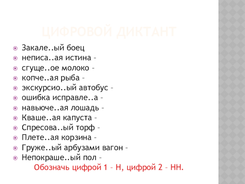 Цифровой диктантЗакале..ый боецнеписа..ая истина – сгуще..ое молоко – копче..ая рыба – экскурсио..ый автобус – ошибка исправле..а –