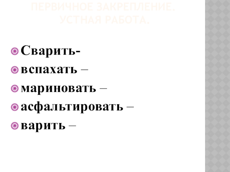 Первичное закрепление.  Устная работа. Сварить- вспахать – мариновать – асфальтировать –варить –