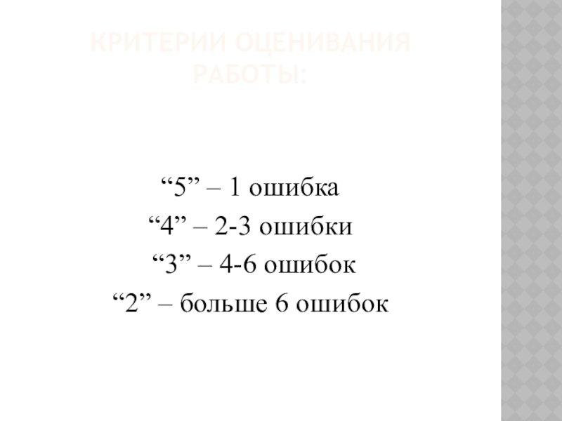 критерии оценивания работы:“5” – 1 ошибка“4” – 2-3 ошибки “3” – 4-6 ошибок“2” – больше 6 ошибок