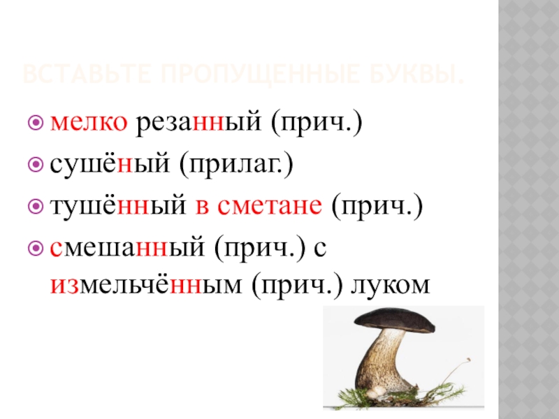 Вставьте пропущенные буквы.мелко резанный (прич.)сушёный (прилаг.)тушённый в сметане (прич.)