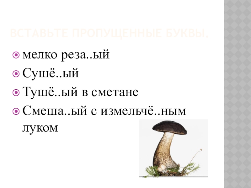 Вставьте пропущенные буквы.мелко реза..ыйСушё..ыйТушё..ый в сметанеСмеша..ый с измельчё..ным луком