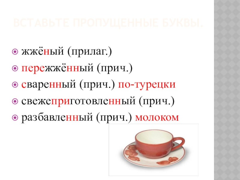 Вставьте пропущенные буквы. жжёный (прилаг.)пережжённый (прич.)сваренный (прич.) по-турецкисвежеприготовленный (прич.)разбавленный (прич.) молоком