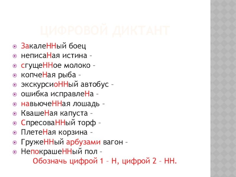 Цифровой диктантЗакалеННый боецнеписаНая истина – сгущеННое молоко – копчеНая рыба – экскурсиоННый автобус – ошибка исправлеНа –