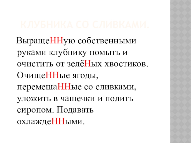 зелёНых хвостиков. ОчищеННые ягоды, перемешаННые со сливками, уложить в чашечки и полить сиропом. Подавать охлаждеННыми.