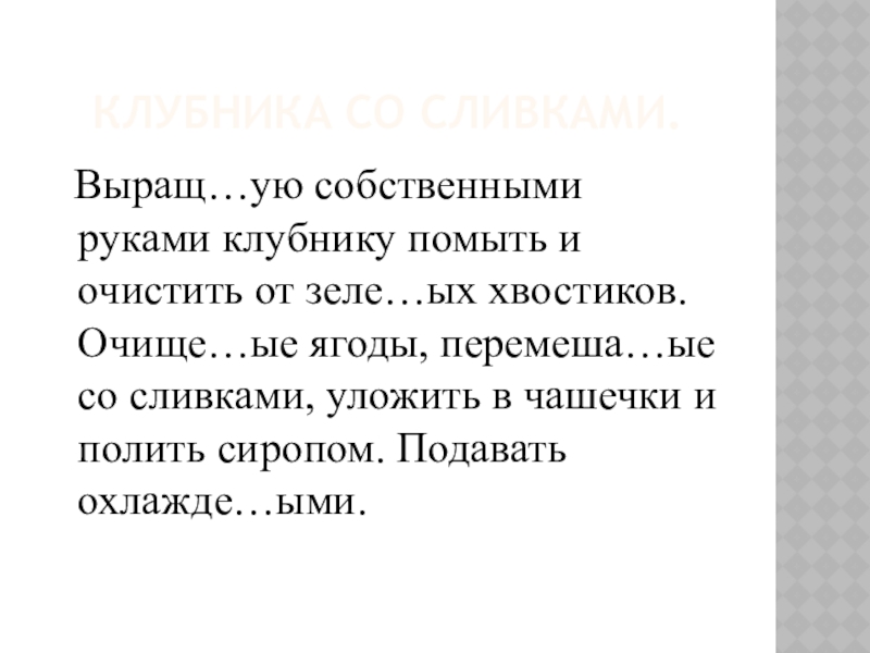 зеле…ых хвостиков. Очище…ые ягоды, перемеша…ые со сливками, уложить в чашечки и полить сиропом. Подавать охлажде…ыми.