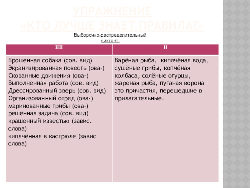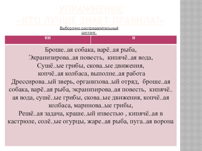 Упражнение  «Кто лучше знает правила?» Выборочно-распределительный диктант.