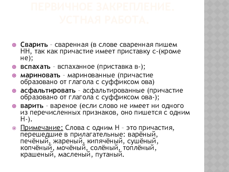 Первичное закрепление.  Устная работа. Сварить – сваренная (в слове сваренная пишем НН, так как причастие имеет