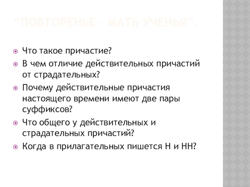 “Повторенье – мать ученья”.Что такое причастие?В чем отличие действительных причастий от страдательных?Почему действительные причастия настоящего времени имеют