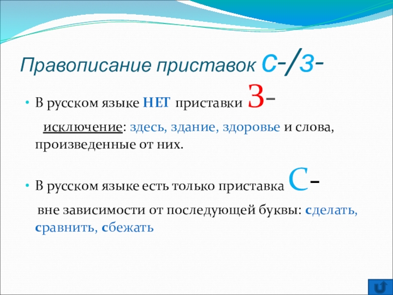 Правописание приставок с-/з-В русском языке НЕТ приставки З-	исключение: здесь, здание, здоровье и слова, произведенные от них.В русском