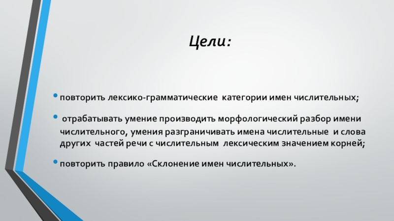 разбор имени числительного, умения разграничивать имена числительные и слова других частей речи с числительным лексическим значением корней;