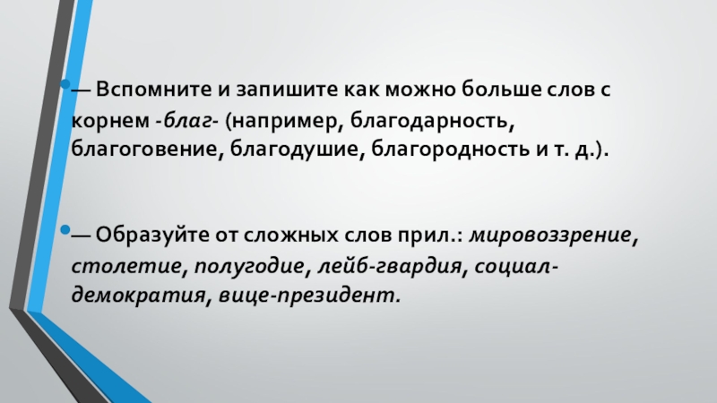 Слайд 5— Вспомните и запишите как можно больше слов с корнем -благ-
