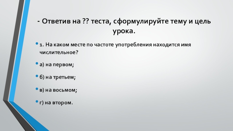 Слайд 10- Ответив на ?? теста, сформулируйте тему и цель урока.