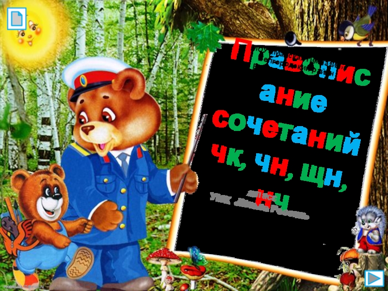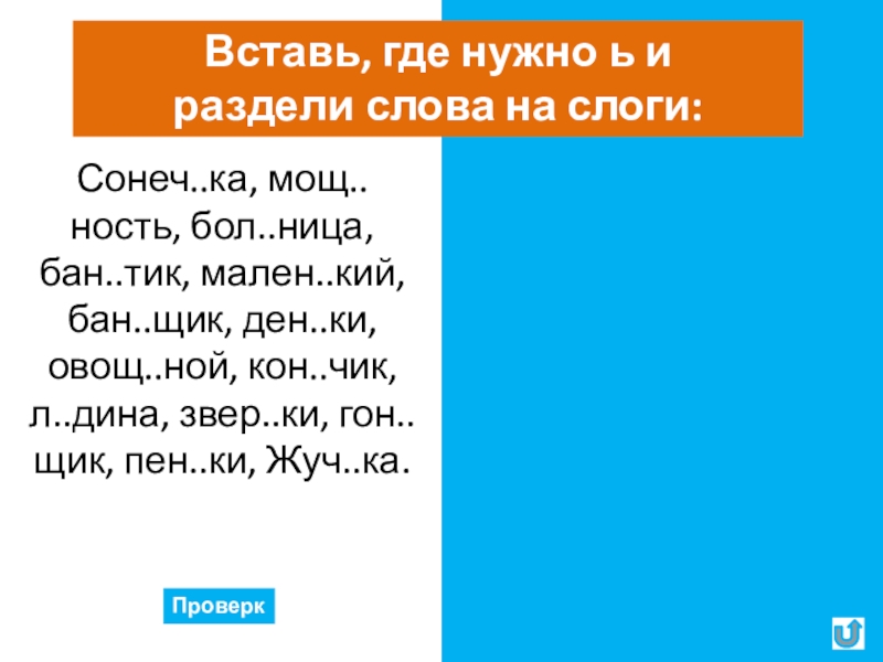 Со-неч-ка, мощ-ность, боль-ни-ца, бан-тик, ма-лень-кий, бан-щик, день-ки, о-вощ-ной, кон-чик, льди-на, зверь-ки, гон-щик, пень-ки, Жуч-ка.