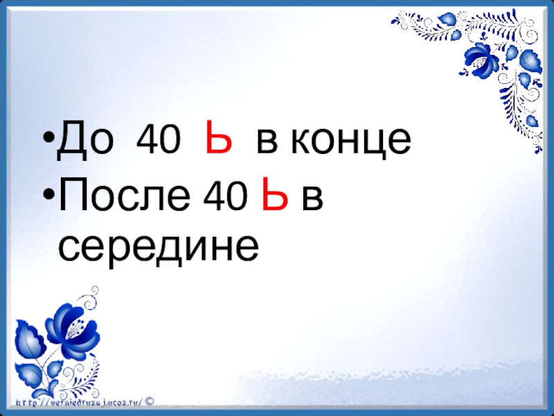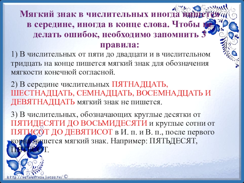 3) В числительных, обозначающих круглые десятки от ПЯТИДЕСЯТИ ДО ВОСЬМИДЕСЯТИ и круглые сотни от ПЯТИСОТ ДО ДЕВЯТИСОТ в И. п. и В. п., после первого корня пишется мягкий знак. Например: ПЯТЬДЕСЯТ, ПЯТЬСОТ.