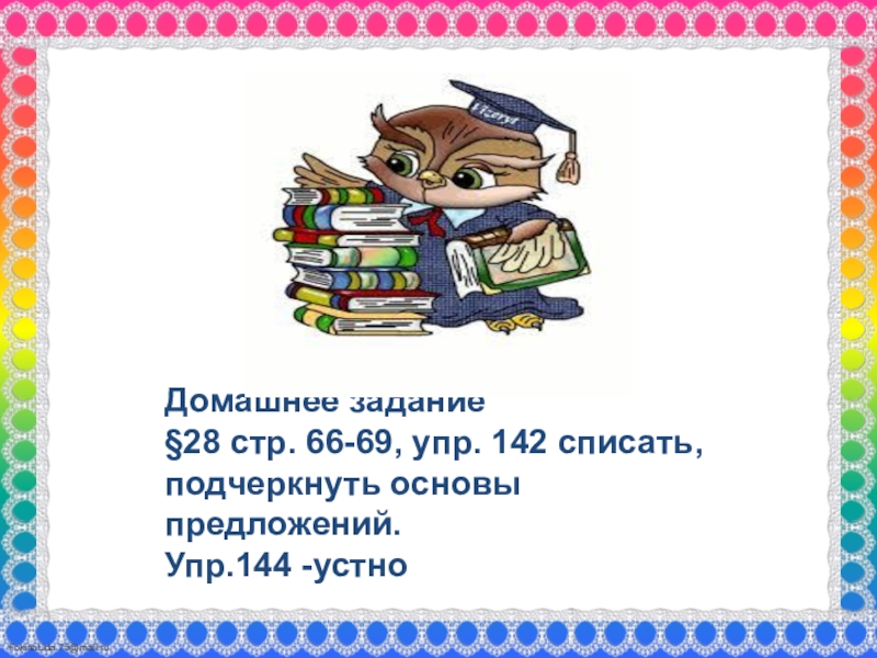 Домашнее задание§28 стр. 66-69, упр. 142 списать,подчеркнуть основы предложений. Упр.144 -устно