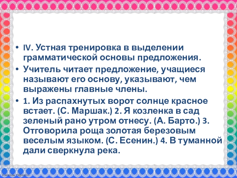 IV. Устная тренировка в выделении грамматической основы предложения.