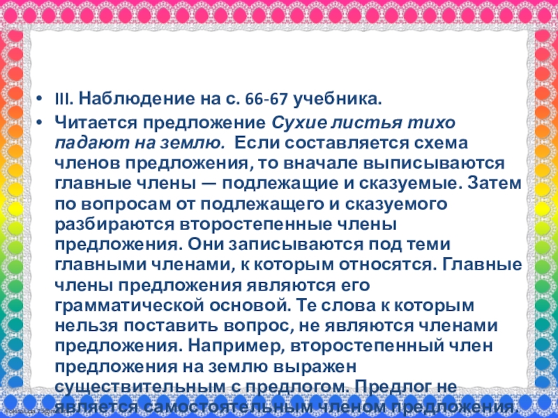 III. Наблюдение на с. 66-67 учебника.Читается предложение Сухие листья тихо падают на землю. Если составляется схема членов