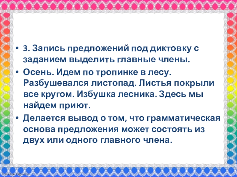 3. Запись предложений под диктовку с заданием выделить главные члены.Осень. Идем по тропинке в лесу. Разбушевался листопад.