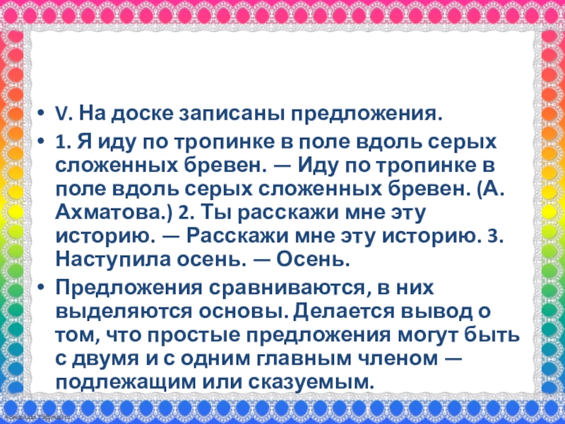 вдоль серых сложенных бревен. — Иду по тропинке в поле вдоль серых сложенных бревен. (А. Ахматова.) 2. Ты расскажи мне эту историю. — Расскажи мне эту историю. 3. Наступила осень. — Осень.
