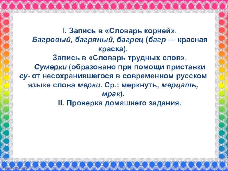 I. Запись в «Словарь корней».Багровый, багряный, багрец (багр — красная краска). Запись в «Словарь трудных слов».Сумерки (образовано при помощи приставки су- от несохранившегося в современном русском языке слова мерки. Ср.: меркнуть, мерцать, мрак).II. Проверка домашнего задания.