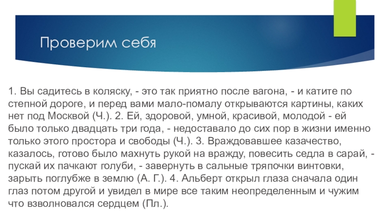 вагона, - и катите по степной дороге, и перед вами мало-помалу открываются картины, каких нет под Москвой (Ч.). 2. Ей, здоровой, умной, красивой, молодой - ей было только двадцать три года, - недоставало до сих пор в жизни именно только этого простора и свободы (Ч.). 3. Враждовавшее казачество, казалось, готово было махнуть рукой на вражду, повесить седла в сарай, - пускай их пачкают голуби, - завернуть в сальные тряпочки винтовки, зарыть поглубже в землю (А. Г.). 4. Альберт открыл глаза сначала один глаз потом другой и увидел в мире все таким неопределенным и чужим что взволновался сердцем (Пл.).