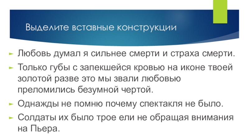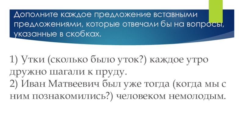 Слайд 8Дополните каждое предложение вставными предложениями, которые отвечали бы на вопросы, указанные