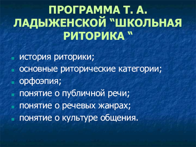 Слайд 7ПРОГРАММА Т. А. ЛАДЫЖЕНСКОЙ “ШКОЛЬНАЯ РИТОРИКА “