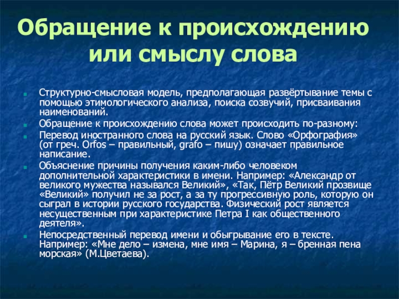 Непосредственный перевод имени и обыгрывание его в тексте. Например: «Мне дело – измена, мне имя – Марина, я – бренная пена морская» (М.Цветаева).