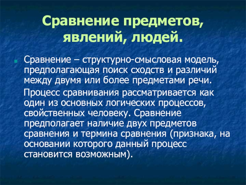 Процесс сравнивания рассматривается как один из основных логических процессов, свойственных человеку. Сравнение предполагает наличие двух предметов сравнения и термина сравнения (признака, на основании которого данный процесс становится возможным).
