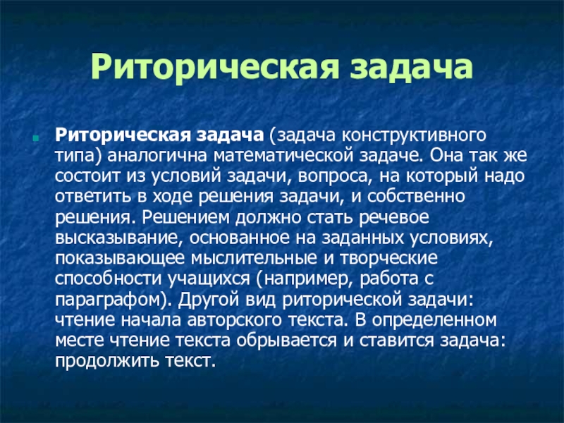 же состоит из условий задачи, вопроса, на который надо ответить в ходе решения задачи, и собственно решения. Решением должно стать речевое высказывание, основанное на заданных условиях, показывающее мыслительные и творческие способности учащихся (например, работа с параграфом). Другой вид риторической задачи: чтение начала авторского текста. В определенном месте чтение текста обрывается и ставится задача: продолжить текст.