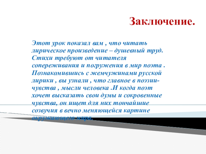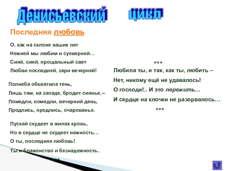 Любовь для поэта – и «блаженство», и «безнадёжность», и напряжённое чувство, несущее человеку страдание и счастье, «поединок роковой» двух сердец. С особым драматизмом тема любви раскрылась в стихах, посвящённых Е.А.Денисьевой.