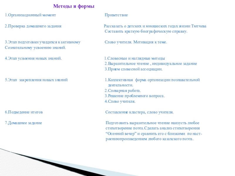 План урока Методы и формы