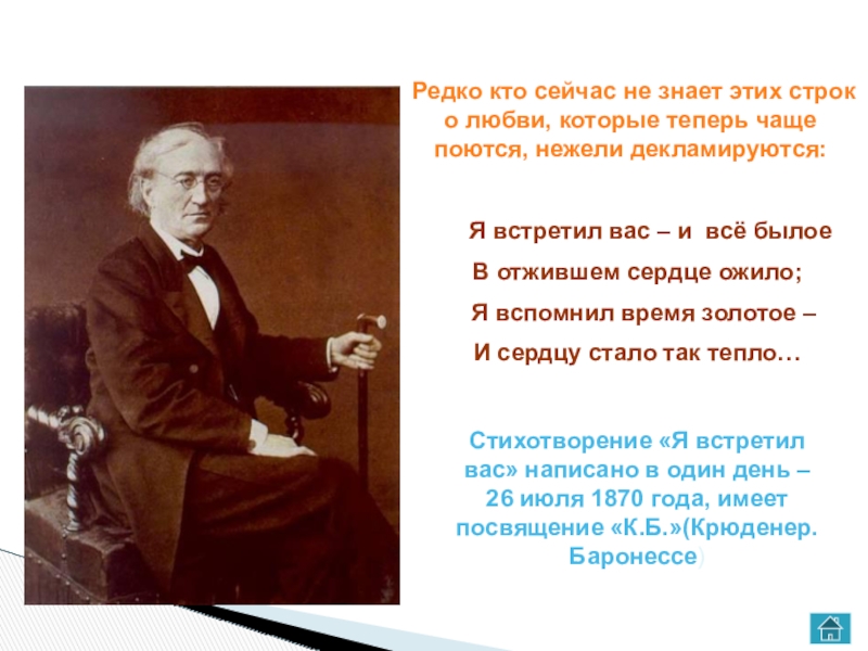 Стихотворение «Я встретил вас» написано в один день – 26 июля 1870 года, имеет посвящение «К.Б.»(Крюденер.Баронессе)