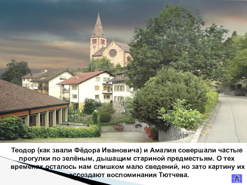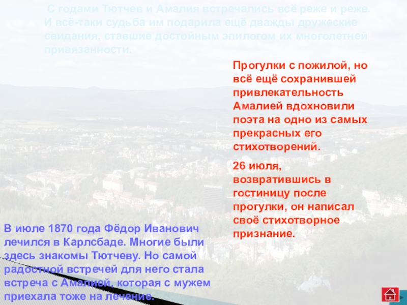 В июле 1870 года Фёдор Иванович лечился в Карлсбаде. Многие были здесь знакомы Тютчеву. Но самой радостной встречей для него стала встреча с Амалией, которая с мужем приехала тоже на лечение.
