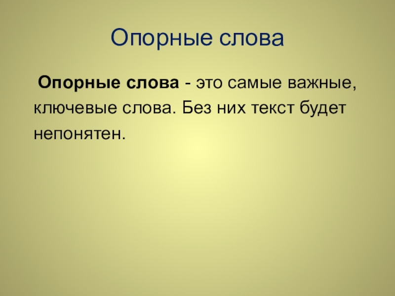 Опорные слова   Опорные слова - это самые важные,    ключевые слова. Без них