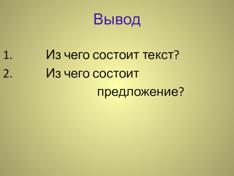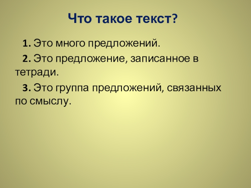 Что такое текст?    1. Это много предложений.  2. Это предложение, записанное в