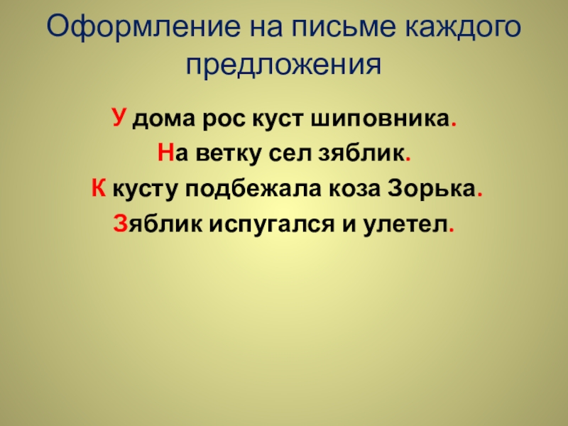 Оформление на письме каждого предложенияУ дома рос куст шиповника. На ветку сел зяблик. К кусту подбежала коза