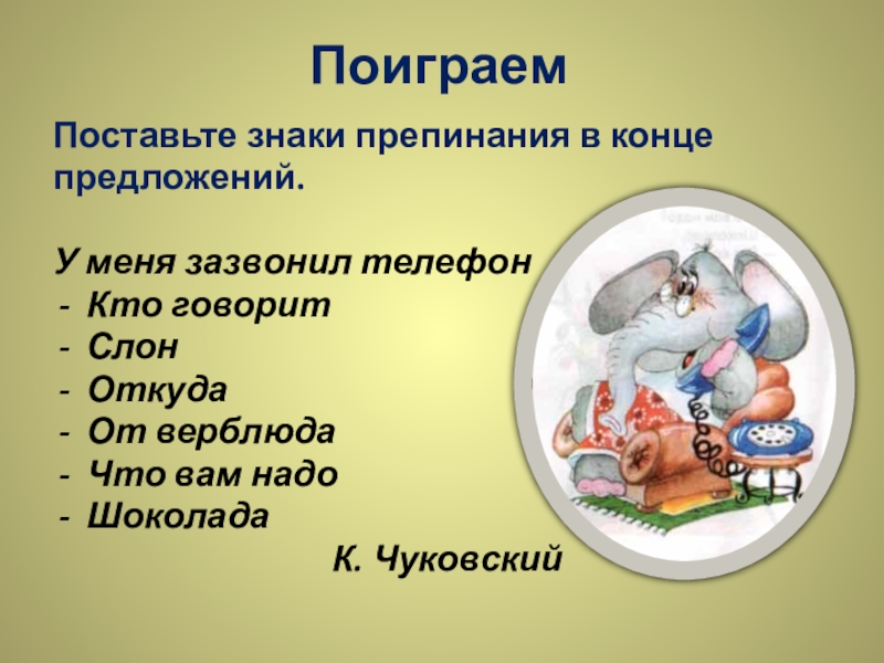 ПоиграемПоставьте знаки препинания в конце предложений.У меня зазвонил телефонКто говорит Слон ОткудаОт верблюдаЧто вам надоШоколада