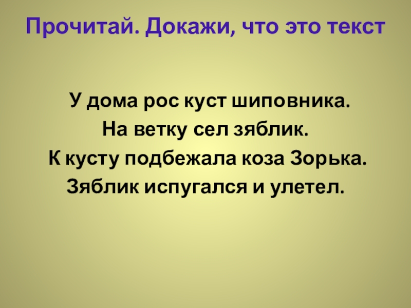 Прочитай. Докажи, что это текст У дома рос куст шиповника. На ветку сел зяблик. К кусту подбежала