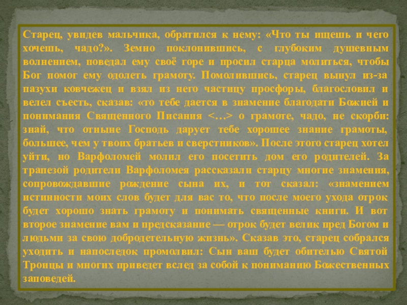хочешь, чадо?». Земно поклонившись, с глубоким душевным волнением, поведал ему своё горе и просил старца молиться, чтобы Бог помог ему одолеть грамоту. Помолившись, старец вынул из-за пазухи ковчежец и взял из него частицу просфоры, благословил и велел съесть, сказав: «то тебе дается в знамение благодати Божией и понимания Священного Писания <…> о грамоте, чадо, не скорби: знай, что отныне Господь дарует тебе хорошее знание грамоты, большее, чем у твоих братьев и сверстников». После этого старец хотел уйти, но Варфоломей молил его посетить дом его родителей. За трапезой родители Варфоломея рассказали старцу многие знамения, сопровождавшие рождение сына их, и тот сказал: «знамением истинности моих слов будет для вас то, что после моего ухода отрок будет хорошо знать грамоту и понимать священные книги. И вот второе знамение вам и предсказание — отрок будет велик пред Богом и людьми за свою добродетельную жизнь». Сказав это, старец собрался уходить и напоследок промолвил: Сын ваш будет обителью Святой Троицы и многих приведет вслед за собой к пониманию Божественных заповедей.