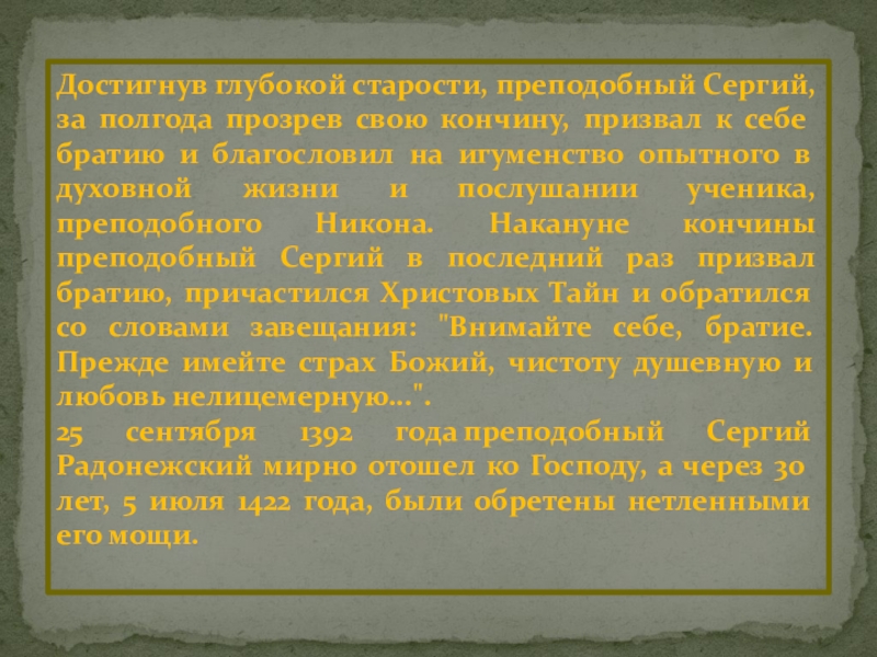 Слайд 21Достигнув глубокой старости, преподобный Сергий, за полгода прозрев свою кончину, призвал
