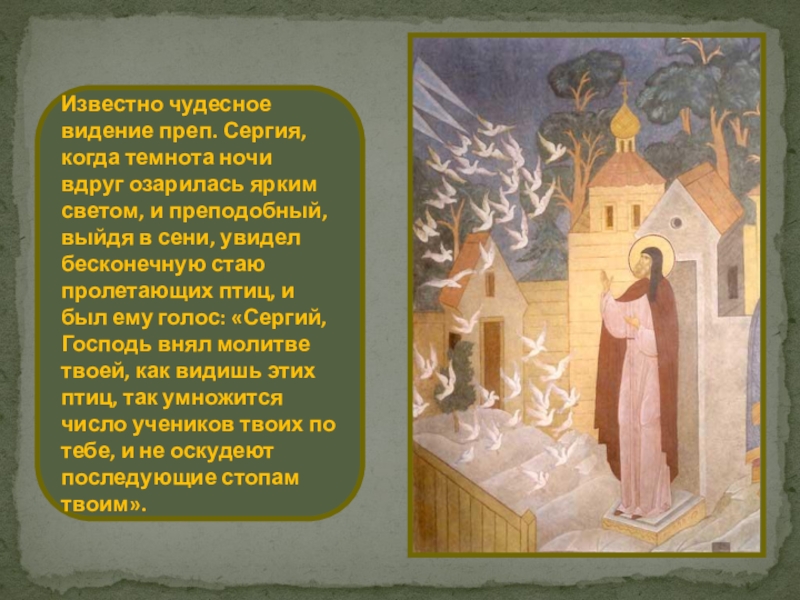 светом, и преподобный, выйдя в сени, увидел бесконечную стаю пролетающих птиц, и был ему голос: «Сергий, Господь внял молитве твоей, как видишь этих птиц, так умножится число учеников твоих по тебе, и не оскудеют последующие стопам твоим».