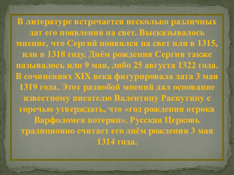 мнение, что Сергий появился на свет или в 1315, или в 1318 году. Днём рождения Сергия также называлось или 9 мая, либо 25 августа 1322 года. В сочинениях XIX века фигурировала дата 3 мая 1319 года. Этот разнобой мнений дал основание известному писателю Валентину Распутину с горечью утверждать, что «год рождения отрока Варфоломея потерян». Русская Церковь традиционно считает его днём рождения 3 мая 1314 года.