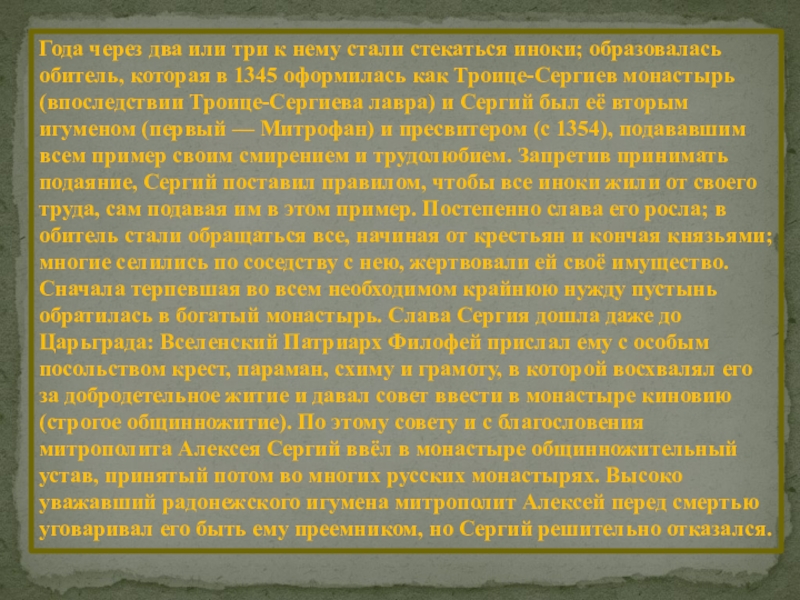 Слайд 12Года через два или три к нему стали стекаться иноки; образовалась