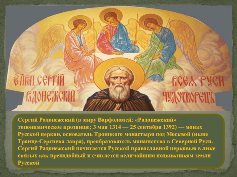 Слайд 2Сергий Радонежский (в миру Варфоломей; «Радонежский» — топонимическое прозвище; 3 мая